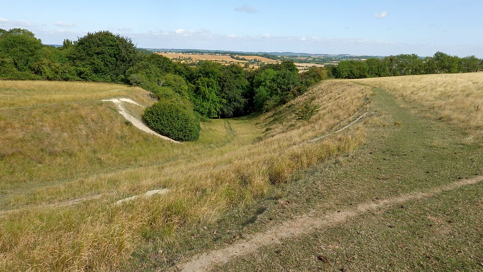 Immediately, the path started to climb to the top of Sundon Hills Country Park via a small disused pit. From the top were views across the ridge towards Sharpenhoe Clappers, site of a promontory fort ( a particular kind of Iron Age hillfort ) situated in a commanding position in the area that provided the best defence. These days it is covered in tall beech trees.